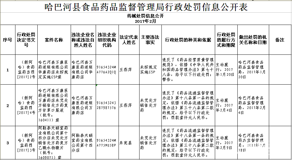 哈巴河县食品药品监督管理局2月药械处罚信息