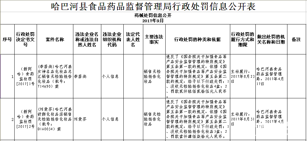 哈巴河县食品药品监督管理局9月药械处罚信息