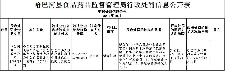 哈巴河县食品药品监督管理局10月药械处罚信息