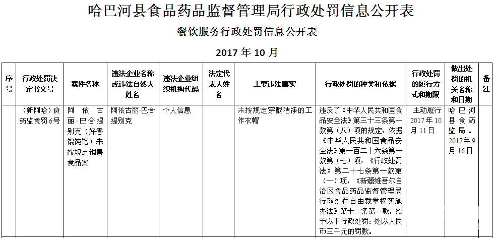 哈巴河县食品药品监督管理局10月餐饮服务行政处罚信息