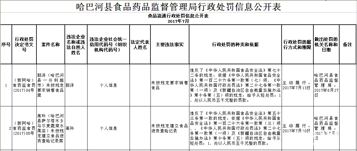 哈巴河县食品药品监督管理局7月食品流通行政处罚信息