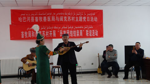 活动中,第三批结亲干部特邀请的“杰特哈巴”音乐队为亲戚们带来了冬不拉独奏、乐器合奏、弹唱、独唱、个人编曲等形式多样的精彩演出,其中《共产党》《美丽的草原》《我们是牧民》等丰富多彩的节目赢得了在场观众们的喜爱。伴着欢快的音乐声,干部与亲戚、村民们一起跳舞、一起欢笑,现场一片其乐融融。