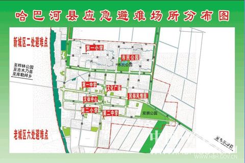 哈巴河县城区常住人口1.8万,当遭受6度地震烈度后,疏散老弱病残幼及中等破坏以上建筑的居民人口估计近有1万。城区避难场所人均2.5平米,规划应急避难场所7处。现有避难场所考虑医疗、供水、供电、物资供应、公厕、停车等功能配套设施,具备平坦开阔的地形,交通方便,有不少于两个安全可靠的出入口,远离不安全的建筑物,滑坡体,不受洪水、易燃易爆物品威胁,便于管理,安全可靠。