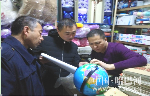 为了进一步贯彻落实自治区全覆盖排查整治“问题地图”专项行动“回头看”工作要求,巩固哈巴河县全覆盖排查整治“问题地图”专项行动取得成效,12月11日,县国土资源局组织工商、民政、网信办、教育局等成员单位联合开展了“问题地图”排查整治专项行动。对新华书店、蓝月亮精品屋、超人文体书店、佳家超市书店等文化用品店进行了检查,检查涉及地球仪3种、地图10余种,并向商家介绍如何准确辨认合格地图、讲解国家新发布的《地图审核管理规定》,经查未发现分裂国家、危害国家主权、泄露国家秘密的“问题地图”。