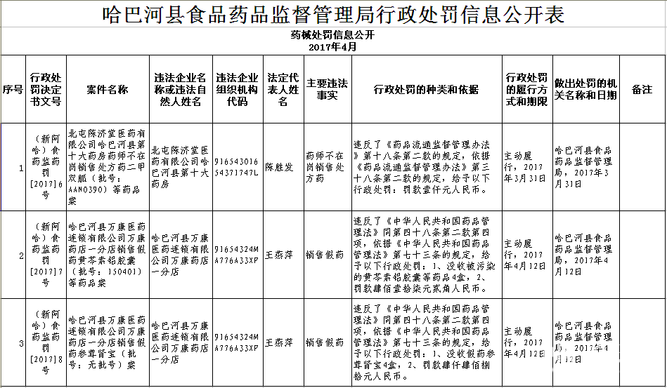 哈巴河县食品药品监督管理局4月药械处罚信息