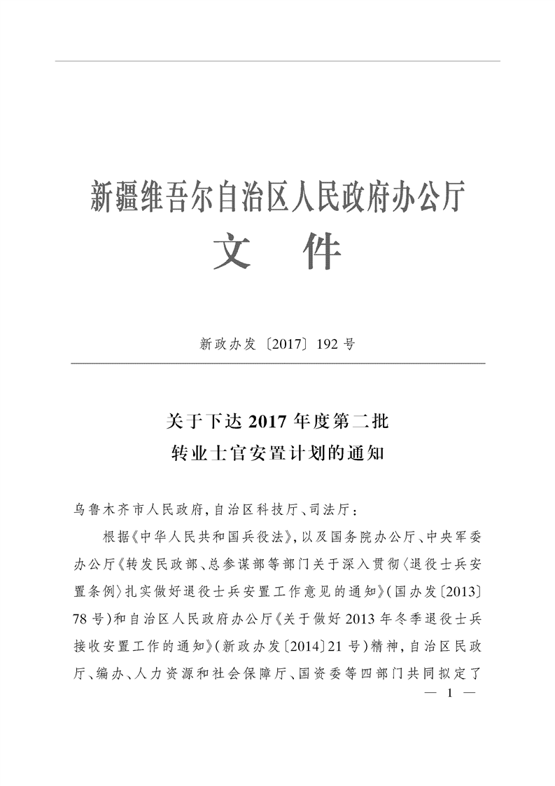 关于下达2017年度第二批转业士官安置计划的通知