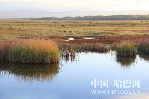 阿克齐湿地与哈巴河县城相毗邻,东西宽约2公里,南北长约10公里,湿地内溪流遍布,水草丰茂,孕育多种水生动植物,不仅是鱼虫禽鸟生活的乐