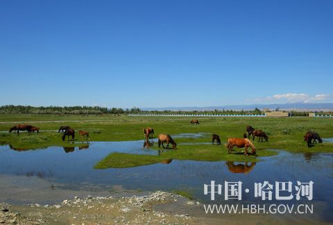 哈巴河县阿克齐湿地,芦苇蒲草成片相连,湖水碧波荡漾,鱼翔浅底,草木繁茂,绿色苍茫,百鸟鸣啼,微风吹拂,芦苇摇曳,此起彼伏,颇为壮观,置身其中,如同进入世外桃源一般。