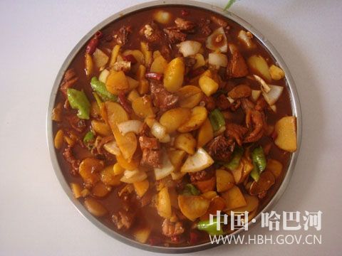 新疆大盘鸡又名为沙湾大盘鸡,是新疆名菜,起源于20世纪80年代后期,主要用料为鸡块和土豆块,配皮带面烹饪而成。 色彩鲜艳、爽滑麻辣的鸡肉和软糯甜润的土豆,辣中有香、粗中带细,是餐桌上的佳品。