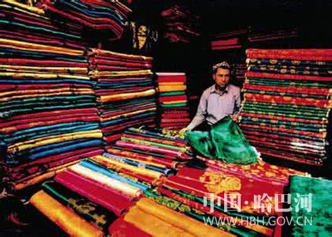 维吾尔族妇女十分喜爱的丝绸料,以色彩绚丽、鲜艳著称。用色反差大,对比强烈。它常用翠绿、宝蓝、黄、青、桃红、紫红、桔、金黄、艳绿、黑、白等色;图案结构细腻、紧凑、严谨,色彩强烈、透明、逼真,再现了大自然中光和色的美感。